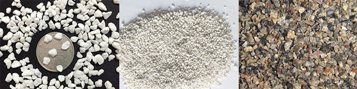 珍珠巖的粒 度在20~60目,60~80目珍珠巖按加工程度的不同,其產品可分為珍珠巖原礦、珍珠巖礦砂、膨脹珍珠巖及表面處理的膨脹珍珠巖四類。