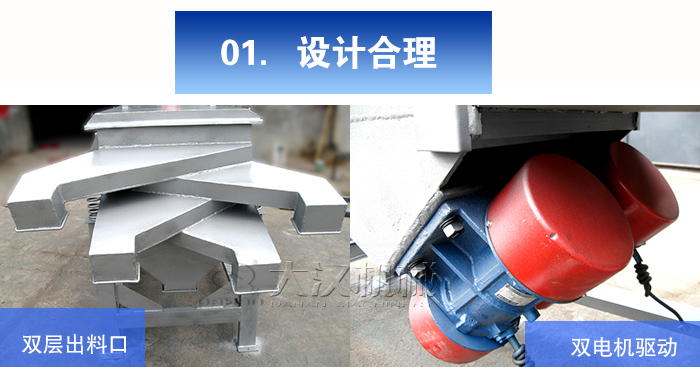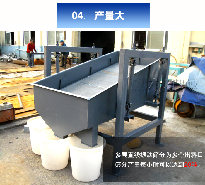 多層直線振動篩分為多個出料口,可把篩分物料按大小粒度分為多個等級,物料篩分規格多,篩分后的物料可以自動排出,采用雙臺電機驅動,振動力更強,物料篩分更徹底,篩分產量每小時可以達到20噸。