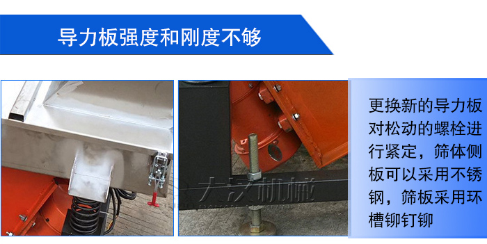 出現這種情況,需要更換新的導力板,對松動的螺栓進行緊定,篩體側板可以采用不銹鋼,篩板采用環槽鉚釘鉚接,保證篩體輕度和剛度足夠強。