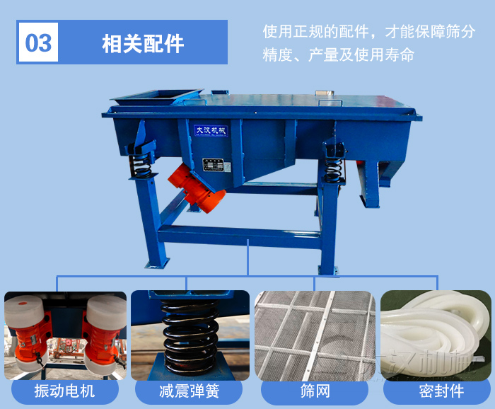 直線振動(dòng)篩的配件包含:振動(dòng)電機(jī)、減震彈簧、密封件、篩網(wǎng)、清網(wǎng)裝置,振動(dòng)電機(jī)作為臺(tái)篩分設(shè)備的動(dòng)力源其優(yōu)劣直接關(guān)系到設(shè)備的產(chǎn)量與使用壽命,篩網(wǎng)的選用也應(yīng)該注重篩網(wǎng)的絲經(jīng)、材質(zhì),配件需要有正規(guī)的配件供應(yīng)商提供,這樣才能保障篩分精度、產(chǎn)量及使用壽命,而選擇不同配置的設(shè)備,其價(jià)格勢(shì)必會(huì)有所影響,舉例來說,防爆電機(jī)與普通電機(jī)相比,價(jià)格會(huì)貴200-300元,非金屬篩網(wǎng)相較金屬篩網(wǎng)會(huì)便宜50%。